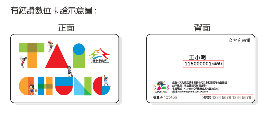 本卡證是臺中市「寶貝咱ㄟ囝仔-台中有鈣讚計畫」政策使用的悠遊卡,供幼生家長兌換鮮奶,亦可作為一般悠遊卡(普通卡)使用其他消費或服務,但是沒有兒童特殊身分優惠,建議領取後可透過悠遊卡公司官網或「Easy Wallet」APP申辦記名。